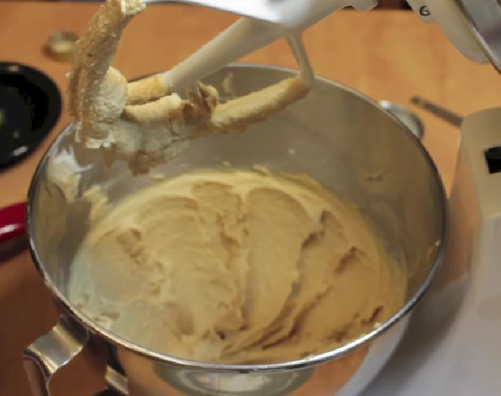 Battre le beurre ramolli avec le beurre de cacahuète, ensuite ajouter le sucre en poudre, la cassonade, l’œuf, la vanille et le sel et continuer à battre jusqu’à consistance crémeuse.