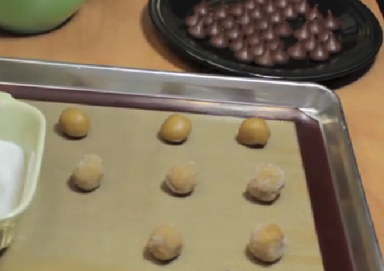 Dés la sortie du four, insérer immédiatement un chocolat kisses dans chaque cookies encore chaude en appuyant légèrement.