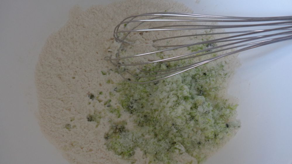 Mélanger dans un autre bol les ingrédients liquides ( œuf, lait, huile jus de citron vert et rhum). Incorporer ce mélange sur les ingrédients secs et fouetter sans trop insister.