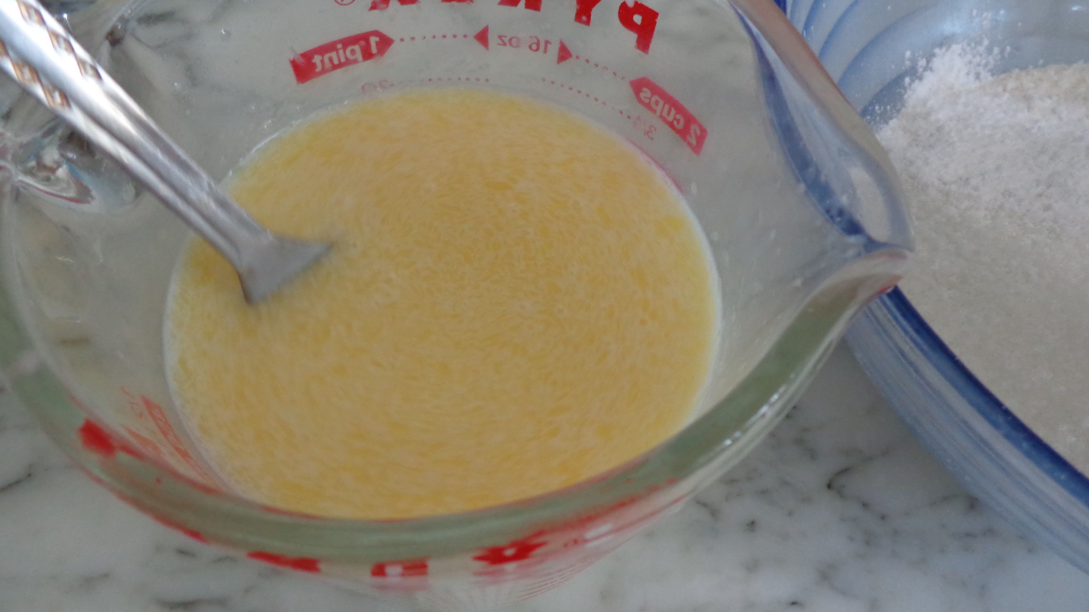 Mettre le lait avec le beurre fondu et tiédi et les oeufs et mélanger grossièrement à l’aide d’une fourchette juste pour crever les oeufs.