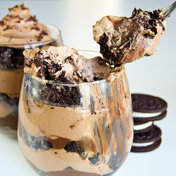 Crème à fouetter, froid 2 cuillères à soupe de sucre Pudding au chocolat Biscuits oreo écrasé