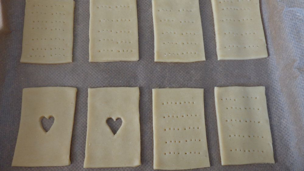 Étaler la pâte sur un plan fariné . Découper des rectangles de pâte de 9 x 6,5. Piquer chaque rectangle à l’aide d’une fourchette,
