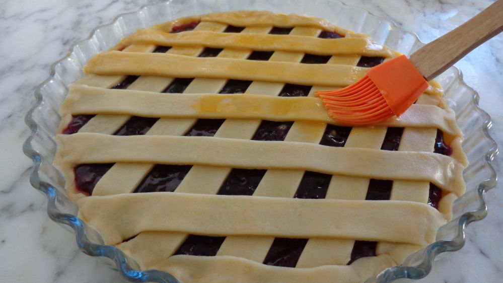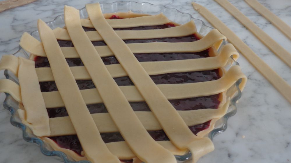 Étaler le reste de pâte et découper des lanières de mêmes largeurs à l’aide d’une roulette ou un couteau (on peut s’en servir d’une règle ou du rouleau à pâtisserie) . Réaliser avec ces lanières un quadrillage sur le dessus de la tarte.